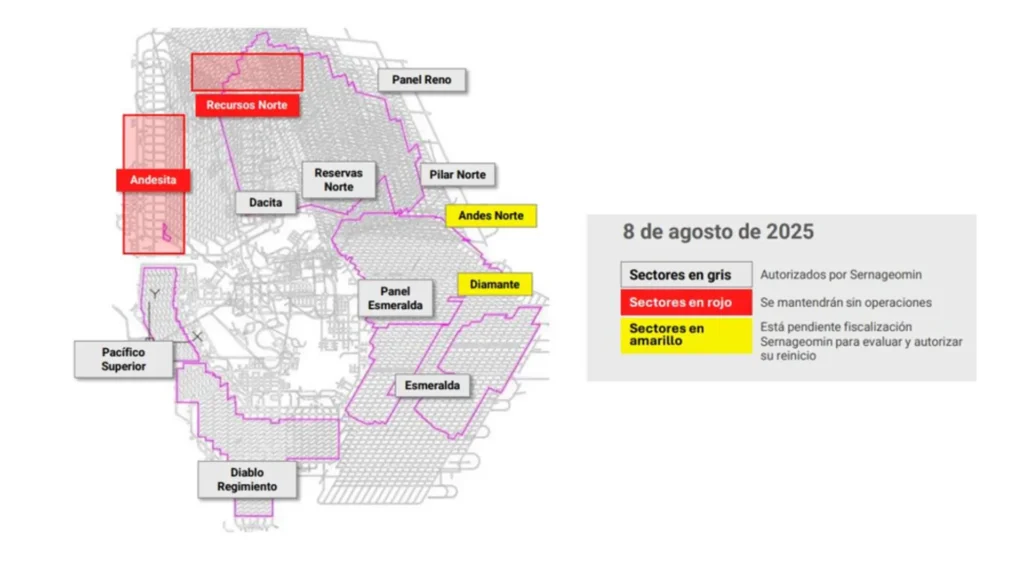 La medida, confirmada a través de un comunicado difundido también por la estatal, permite que varias áreas retomen su actividad, tras verificarse las condiciones de seguridad en terreno y recibir el visto bueno técnico de Sernageomin. Entre los sectores que pueden reabrir están Pilar Norte, Panel Esmeralda, Esmeralda, Pacífico Superior, Diablo Regimiento, Panel Reno, Dacita y Reservas Norte.