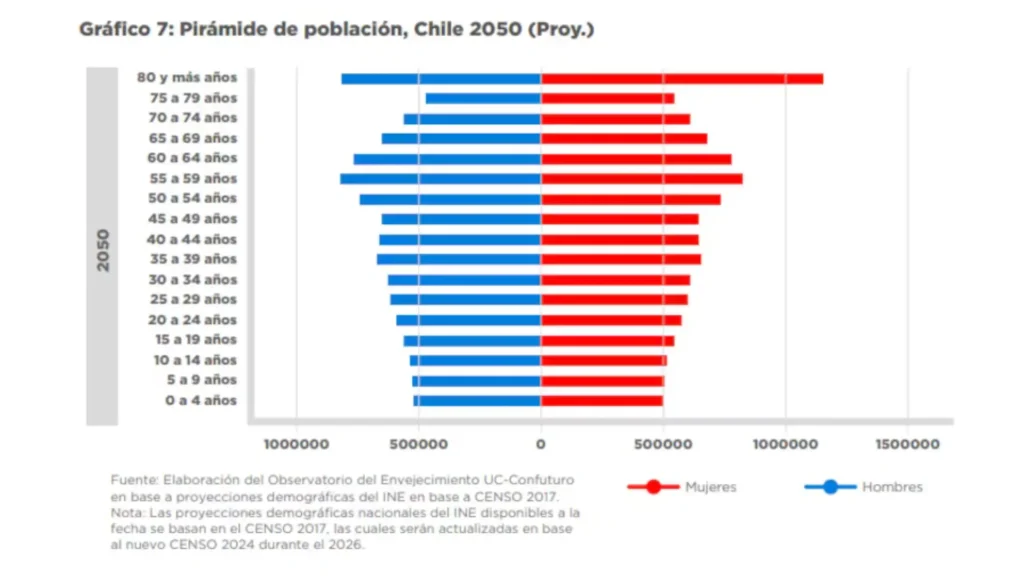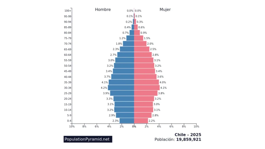 Según el sitio PopulationPyramid.net, “La pirámide 2025 de Chile muestra transición demográfica avanzada: baja natalidad, abultamiento adulto y envejecimiento acelerado, con 19,86 millones de habitantes. El foco de política debe moverse a pensiones, cuidados, productividad y salud para una población que vive más y nace menos.”