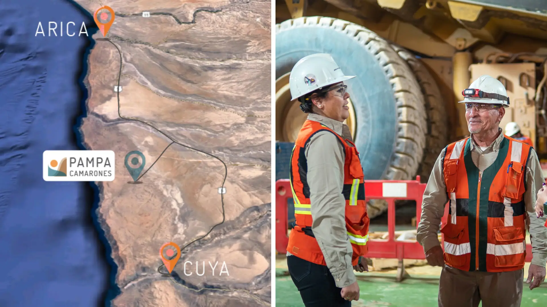 Ubicada en la comuna de Camarones, a unos 80 kilómetros al sur de Arica y a escasa distancia del mar, la faena destaca por combinar operación minera con un entorno que facilita el retorno diario al hogar para buena parte de sus trabajadores. La empresa se define como una operación de “minería moderna”, con fuerte énfasis en la seguridad, el uso de energías renovables y la relación con las comunidades vecinas, especialmente la comuna de Camarones.