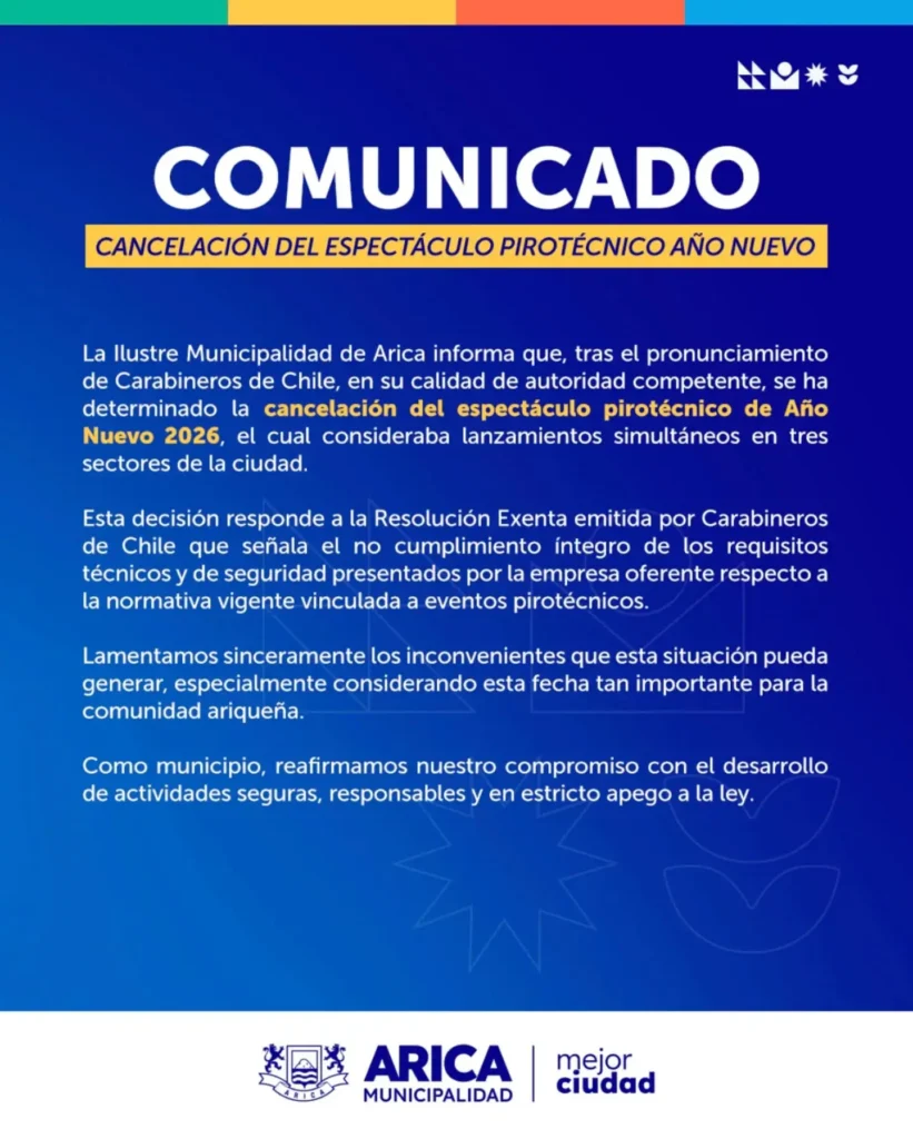 La celebración municipal de Año Nuevo en Arica no contará con fuegos artificiales, luego de que Carabineros no otorgará el permiso necesario para ejecutar el espectáculo pirotécnico. La suspensión se justificó «atendiendo aspectos técnicos esenciales para garantizar que este tipo de eventos».